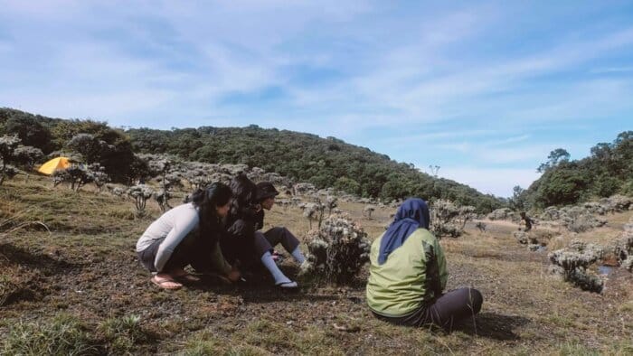 Berkemah di Lembah Mandalawangi adalah pengalaman yang jarang dilupakan. Area datar di pinggiran lembah bisa menampung beberapa tenda kecil, dan pemandangan pagi hari di tengah kabut benar-benar magis.